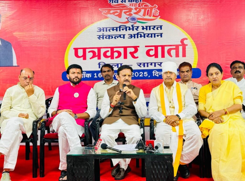 सागर में आत्मनिर्भर भारत स्वदेशी संकल्प अभियान के अंतर्गत उपमुख्यमंत्री एवं प्रभारी मंत्री ने पत्रकार वार्ता को संबोधित किया