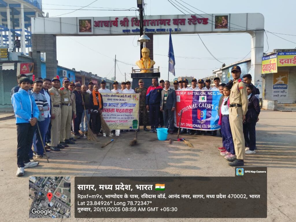 33 मध्यप्रदेश एनसीसी बटालियन के अंतर्गत शासकीय संभागीय आई आई टी आई सागर के एनसीसी कैडेट के द्वारा एन सी सी दिवस सप्ताह के अंतर्गत , आचार्य श्री विद्यासागर बस स्टैंड खुरई रोड सागर में स्वक्षता रैली के रूप में पहुंचकर सफाई मित्रों के साथ बस स्टैंड परिसर , यात्री प्रतीक्षालय की साफ सफाई की और डिपोजल, प्लास्टिक पाउच के हानिकारक दुष्प्रभावों को यात्रियों और दुकानदारों को बताया एवं अपने संस्थानों के बाहर हमेशा डस्ट बिन के प्रयोग करने का अनुरोध किया, तत्पश्चात डॉ भीम राव आंबेडकर के स्टेच्यू की साफ सफाई एनसीसी कैडेट के द्वारा की गई और उन्हें मल्यार्पण कर सागर शहर को स्वक्षता में नंबर 01 पर लाने हेतु संकल्प लिया। इस अवसार पर श्री लखनलाल अहिरवार, लेफ्टिनेंट प्रदीप उपाध्याय, हवलदार प्रवीण, अंडर ऑफिसर रामावतार कुर्मी, अंडर ऑफिसर तुलसी अहिरवार, एवं समस्त ncc कैडेट और आई टी आई के छात्र उपस्थित रहे।