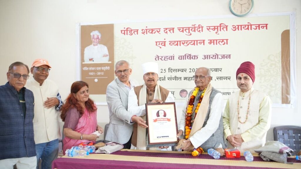 शिक्षक में सृजन और संहार दोनों का होता सामर्थ्य होता है शैलेंद्र जैन पंडित शंकर चतुर्वेदी की तेरहवें स्मरण पर्व का आयोजन चतुर्वेदी एवं तिवारी परिवार तथा श्यामलम संस्था के द्वाराआदर्श संगीत महाविद्यालय में किया गया । कार्यक्रम का प्रारंभ मां सरस्वती, पं शंकर चतुर्वेदी श्री अटल बिहारी वाजपेयी एवं डॉ सर हरि सिंह गौर के चित्र पर माल्यार्पण ,दीप प्रज्वलन के साथ प्रारंभ हुआ श्री उमाकांत मिश्र अध्यक्ष आयोजक संस्था श्यामलाम ने सभी अथितियों का शाल श्रीफल एवम स्मृतिचिन्ह प्रदान कर सम्मान किया।कार्यक्रम के मुख्य अतिथि सागर विधायक शैलेन्द्र जैन ने कहा आज तीन पितृ पुरषों के स्मरण पर्व होने से यह आयोजन अद्भुत हो गया है । स्व. चतुर्वेदी को स्मरण करते हुए कहा कि पंडित शंकर दत्त चतुर्वेदी मेरे पिता के गुरु थे इस रिश्ते से वह मेरे भी गुरु हुए। उनकी प्रतिभा का यदि आपको दर्शन करना है तो आप उनके शिष्यों में उनकी प्रतिभा का दर्शन कर सकते हैं। स्कूल शिक्षा विभाग में शिक्षक होते हुए उन्होंने विश्वविद्यालय के अनेक विद्यार्थियों को पीएचडी करने में मदद की। वह विश्वविद्यालय के कुल सांसद भी रहे। एक शिक्षक में सृजन और संहार दोनों का सामर्थ होता है। सृजनात्मक शक्ति के द्वारा वह अपने विद्यार्थियों को गढ़ता है तथा राष्ट्र विरोधी ताकतों का संहार करता है।