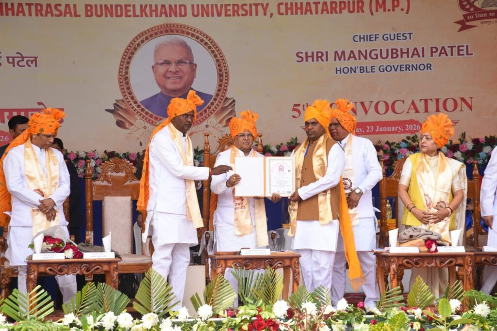 राज्यपाल मंगुभाई पटेल शुक्रवार को वसंत पंचमी के अवसर पर महाराजा छत्रसाल बुंदेलखंड विश्वविद्यालय छतरपुर के पांचवे दीक्षांत समारोह में शामिल हुए। जहां राज्यपाल पटेल को गार्ड ऑफ ऑनर दिया गया। राज्यपाल ने समारोह में 19 विद्यार्थियों को पीएचडी, 46 विद्यार्थियों को स्वर्ण पदक और लगभग 200 विद्यार्थियों को उपाधियां प्रदान की। राज्यपाल ने दीक्षांत समारोह को संबोधित करते हुए कहा कि विद्यार्थी जीवन में नए अवसरों को प्राप्त करने और नई चुनौतियों के समाधान खोजने में अपने ज्ञान और कौशल को निरंतर निखारते रहें। उन्होंने कहा कि विद्यार्थियों को मिली उपाधियां सिर्फ कागज का प्रमाण पत्र नहीं बल्कि जिम्मेदारियों का आमंत्रण पत्र है। उन्होनें विद्यार्थियों से अपील करते हुए कहा कि विद्यार्थी अपने ज्ञान, कौशल, शोध, नवाचार से देश को निरंतर आगे बढ़ाते रहें।