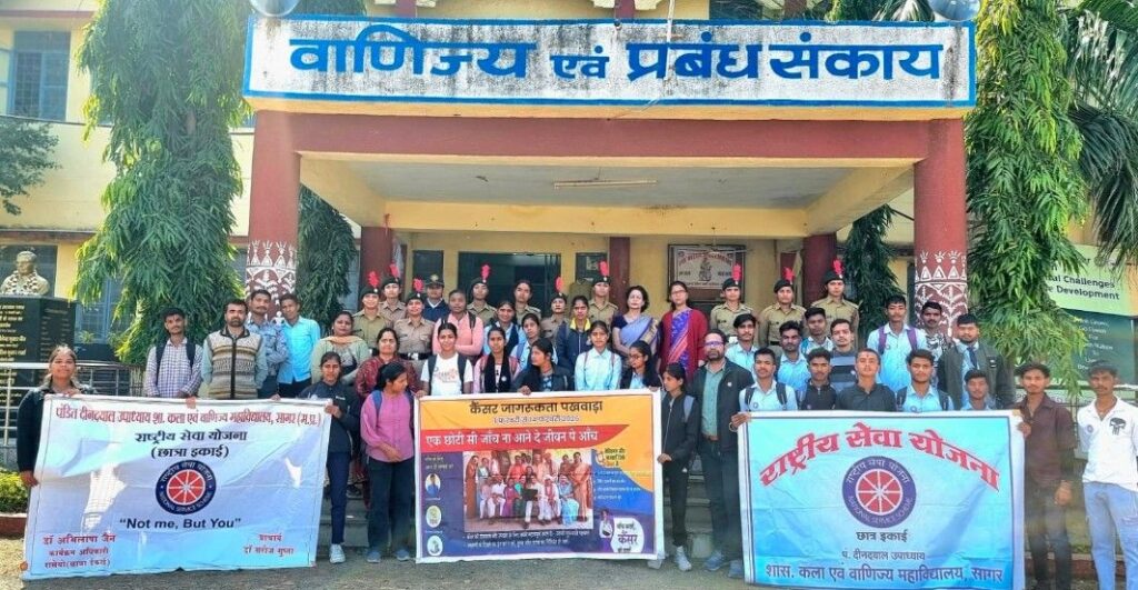 सागर/ शासकीय कला एवं वाणिज्य (अग्रणी) महाविद्यालय, सागर में राष्ट्रीय सेवा योजना छात्र एवं छात्रा इकाई, एनसीसी तथा स्त्री रोग विशेषज्ञ संघ के संयुक्त तत्वावधान में कैंसर जागरूकता पखवाड़ा के अंतर्गत कैंसर जागरूकता कार्यक्रम का आयोजन महाविद्यालय की प्राचार्य डॉ. सरोज गुप्ता के मार्गदर्शन में सफलतापूर्वक किया गया।