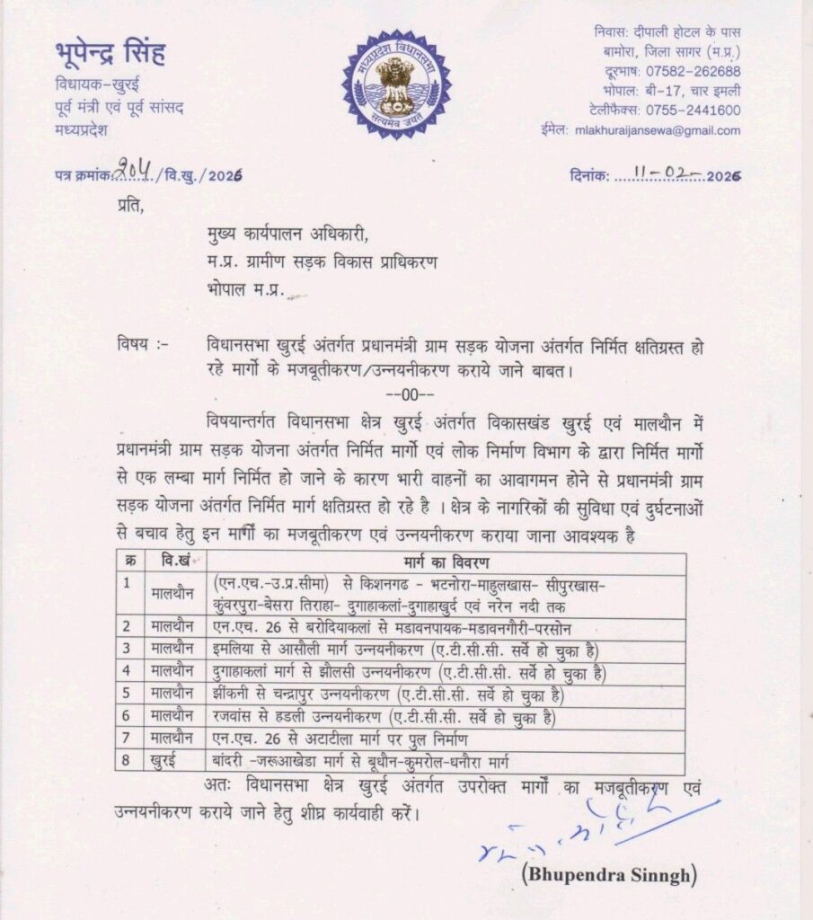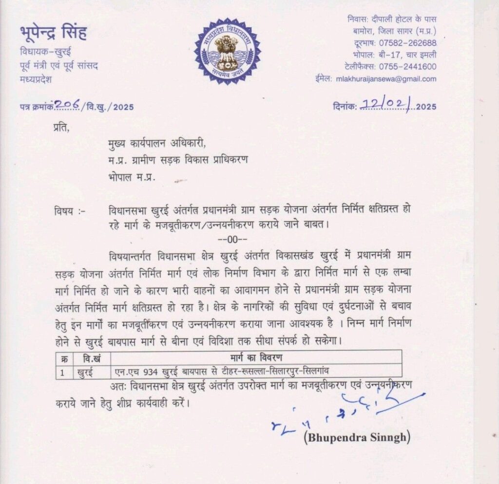 खुरई विधानसभा क्षेत्र की नौ क्षतिग्रस्त सड़कों के उन्नयन व सुदृढ़ीकरण हेतु पूर्व गृहमंत्री, खुरई विधायक भूपेन्द्र सिंह ने मप्र ग्रामीण सड़क विकास प्राधिकरण को पत्र लिखा