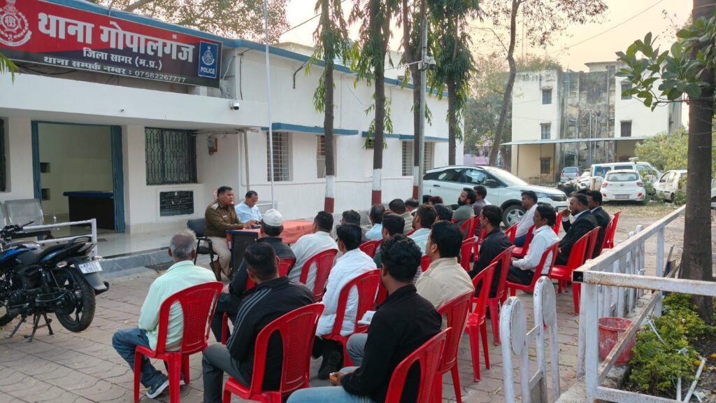 सागर। आगामी त्यौहारों को शांतिपूर्ण, सौहार्दपूर्ण एवं सुरक्षित वातावरण में संपन्न कराने के उद्देश्य से थाना गोपालगंज परिसर में शांति समिति की एक महत्वपूर्ण बैठक आयोजित की गई। यह बैठक क्षेत्र में कानून-व्यवस्था सुदृढ़ रखने तथा विभिन्न आयोजन समितियों के साथ समन्वय स्थापित करने हेतु आयोजित की गई।