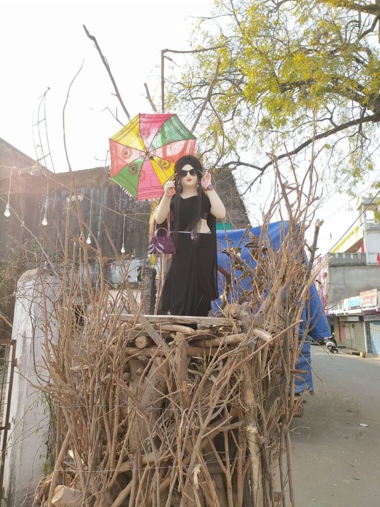 सागर जिले के देवरी के शिक्षा सदन चौराहे पर इस बार होलिका दहन का आयोजन कुछ खास अंदाज में किया जा रहा है। महाकाली गणेश उत्सव समिति द्वारा बनाई गई यह प्रतिमा इस बार सोशल मीडिया पर जमकर चर्चा का विषय बनी हुई है।