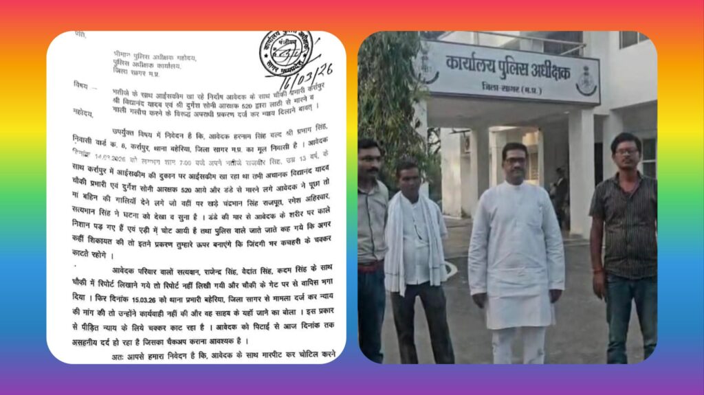 सागर के थाना बहेरिया क्षेत्र अंतर्गत पुलिस चौकी कर्रापुर के प्रभारी व आरक्षक द्वारा सरेआम गुंडागर्दी कर भतीजे के साथ आइसक्रीम खा रहे निर्दोष युवक के साथ गाली-गलौज कर लाठी से मारनें की घटना के पीड़ित युवक हरनाम सिंह पिता प्रभाग सिंह निवासी वार्ड 08 नगर परिषद कर्रापुर ने मध्यप्रदेश शासन के पूर्व मंत्री सुरेन्द्र चौधरी व स्थानीय कांग्रेसजनों के साथ पुलिस अधीक्षक कार्यालय पहुंचकर शिकायती आवेदन देकर उसके साथ गाली गलौज करने वाले दोषी कर्रापुर चौकी प्रभारी विधानन्द यादव व आरक्षक दुर्गेश सोनी पर अपराधिक प्रकरण दर्ज कर कठोर कार्रवाई करने तथा पीड़ित को न्याय दिलाने की गुहार लगाई है। पीड़ित युवक ने पुलिस अधीक्षक को दिये शिकायती आवेदन में बताया कि घटना विगत 14 मार्च शनिवार शाम 07 बजें की हैं जहां पीड़ित युवक अपने भतीजे राजवीर के साथ कर्रापुर में आईसक्रीम खा रहा था तभी अचानक कर्रापुर चौकी प्रभारी विद्यानंद यादव और आरक्षक दुर्गेश सोनी आये और उसे डंडे से मारने लगे आवेदक ने पूछा की क्यों मार रहे हो तो मां बहिन की गालियों देने लगे डंडे की मार से आवेदक के शरीर पर काले निशान पड़ गए हैं एवं एडी में चोट आयी है चौकी प्रभारी और आरक्षक जाते जाते कह गये कि अगर कहीं शिकायत की तो इतने प्रकरण तुम्हारे ऊपर बनाएंगे कि जिंदगी भर कचहरी के चक्कर काटते रहोगे। पुलिस अधीक्षक को शिकायती आवेदन देकर दोषीयों पर प्रकरण दर्ज कर कठोर कार्यवाही व पीड़ित को न्याय दिलानें की मांग पूर्व मंत्री सुरेन्द्र चौधरी, ब्लॉक कांग्रेस अध्यक्ष पुष्पेन्द्र सिंह, पार्षद मोहन अहिरवार, कदम सिंह आदि ने की हैं।