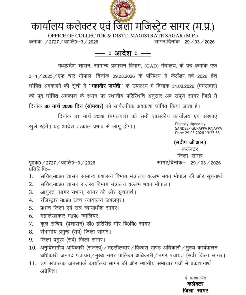 मध्यप्रदेश शासन, सामान्य प्रशासन विभाग (GAD) मंत्रालय द्वारा जारी आदेश के अनुसार कलेक्टर एवं जिला मजिस्ट्रेट संदीप जी आर ने महावीर जयंती के अवसर पर सागर जिले में 30 मार्च 2026 सोमवार को सार्वजनिक अवकाश घोषित किया गया है।