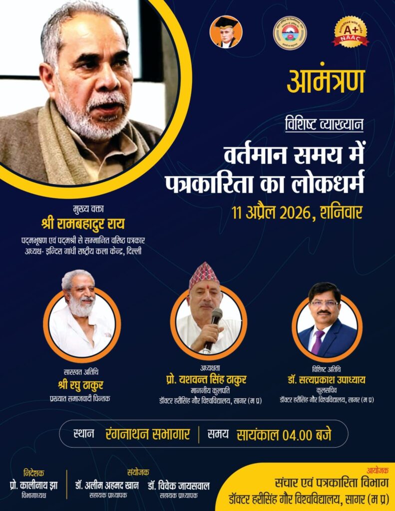 सागर. डॉक्टर हरीसिंह गौर विश्वविद्यालय सागर के संचार एवं पत्रकारिता विभाग के तत्त्वावधान में ‘वर्तमान समय में पत्रकारिता का लोक धर्म’ विषय पर 11 अप्रैल 2026 को अपरान्ह 4 बजे से विश्वविद्यालय के रंगनाथन सभागार में एक विशेष व्याख्यान एवं संवाद कार्यक्रम आयोजित किया गया है| कार्यक्रम में देश के प्रख्यात वरिष्ठ पत्रकार, पद्म भूषण एवं पद्मश्री से सम्मानित श्री राम बहादुर राय जी का व्याख्यान होगा| उक्त कार्यक्रम में सारस्वत अतिथि प्रख्यात समाजवादी चिन्तक श्री रघु ठाकुर एवं विशिष्ट अतिथि कुलसचिव डॉ. सत्य प्रकाश उपाध्याय की उपस्थिति रहेगी. कार्यक्रम की अध्यक्षता विश्वविद्यालय के कुलपति प्रो. वाय. एस. ठाकुर करेंगे| कार्यक्रम के निदेशक प्रो. कालीनाथ झा एवं संयोजक डॉ. अलीम अहमद खान एवं डॉ. विवेक जायसवाल है | कार्यक्रम में विश्वविद्यालय के समस्त शिक्षक, अधिकारी, शोधार्थी, विद्यार्थी एवं सागर शहर के पत्रकारगण आमंत्रित हैं|